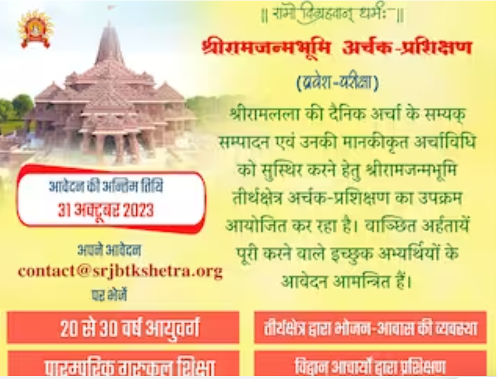 Punjab news point : अयोध्या में बन रहे भव्य राम मंदिर में रामलला की प्राण प्रतिष्ठा से पहले श्री राम जन्मभूमि तीर्थ क्षेत्र ट्रस्ट नए अर्चकों यानि पुजारियों की नियुक्ति करेगा. इसके लिए इच्छुक व्यक्तियों से आवेदन मांगे गए हैं. आवेदन के लिए अंतिम तारीख 31 अगस्त है. चयनित अभ्यर्थियों को 6 माह की ट्रेनिंग दी जाएगी, उसके बाद उन्हें प्रवेश परीक्षा भी देनी होगी.