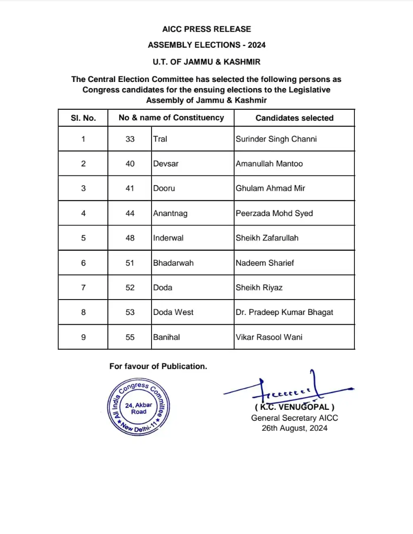 Political : कांग्रेस ने जारी की चुनाव उम्मीदवारों की सूची
